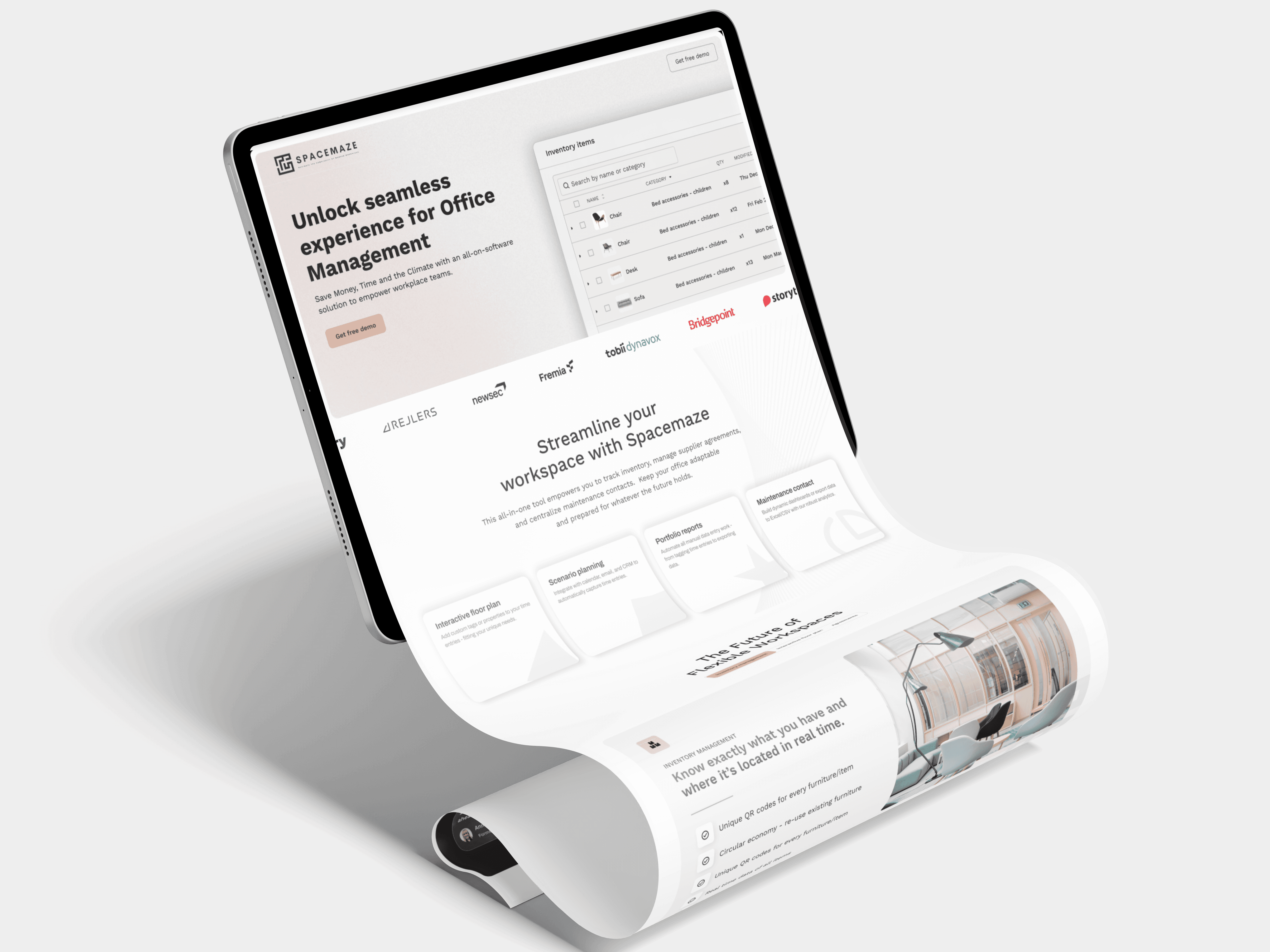 Spacemaze is a B2B software solution that enables businesses to efficiently manage and update their office furniture inventories across multiple locations. The platform offers real-time inventory tracking, interactive floorplan visualization, and QR code integration to simplify asset management.